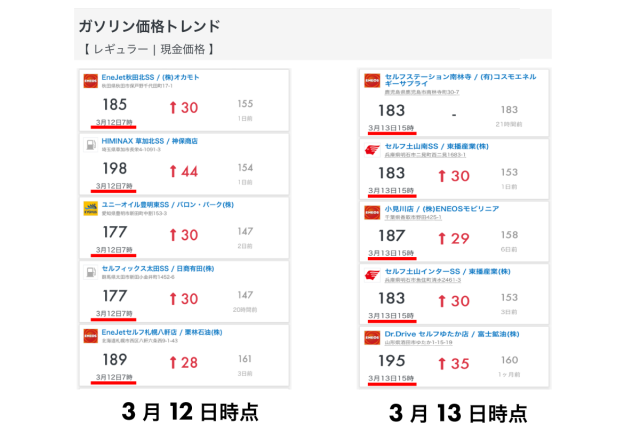 ガソリン価格が大きく値上がりしていることを受けて、最新情報のみ絞り込める機能を追加いたしました!条件設定で「1日以内」を選択してください。
