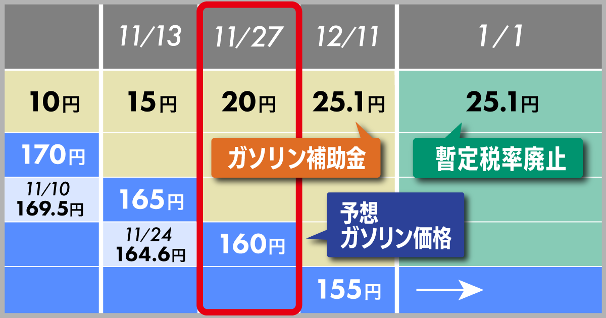 12月11日には、ガソリン補助金の支給額が暫定税率廃止された際と同額 25.1円となるため、暫定税率廃止後の2026年1月からの価格は、12月11日以降の価格と大きく変わりません。