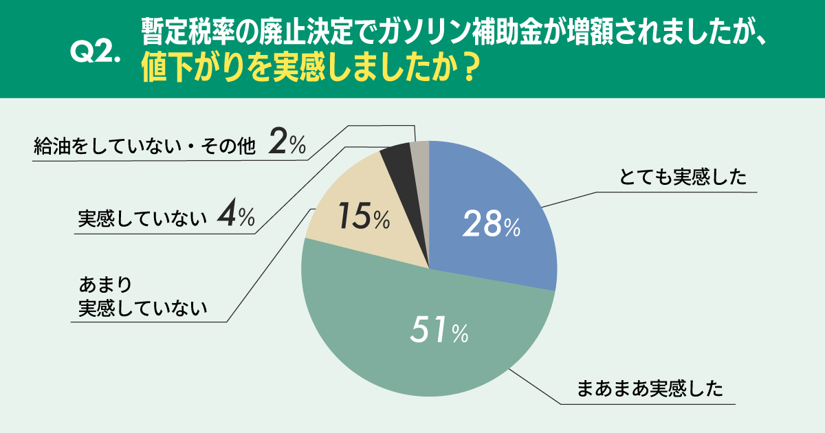 暫定税率廃止決定後の値下がり感について、約8割の方が値下がりを実感している と回答しました。