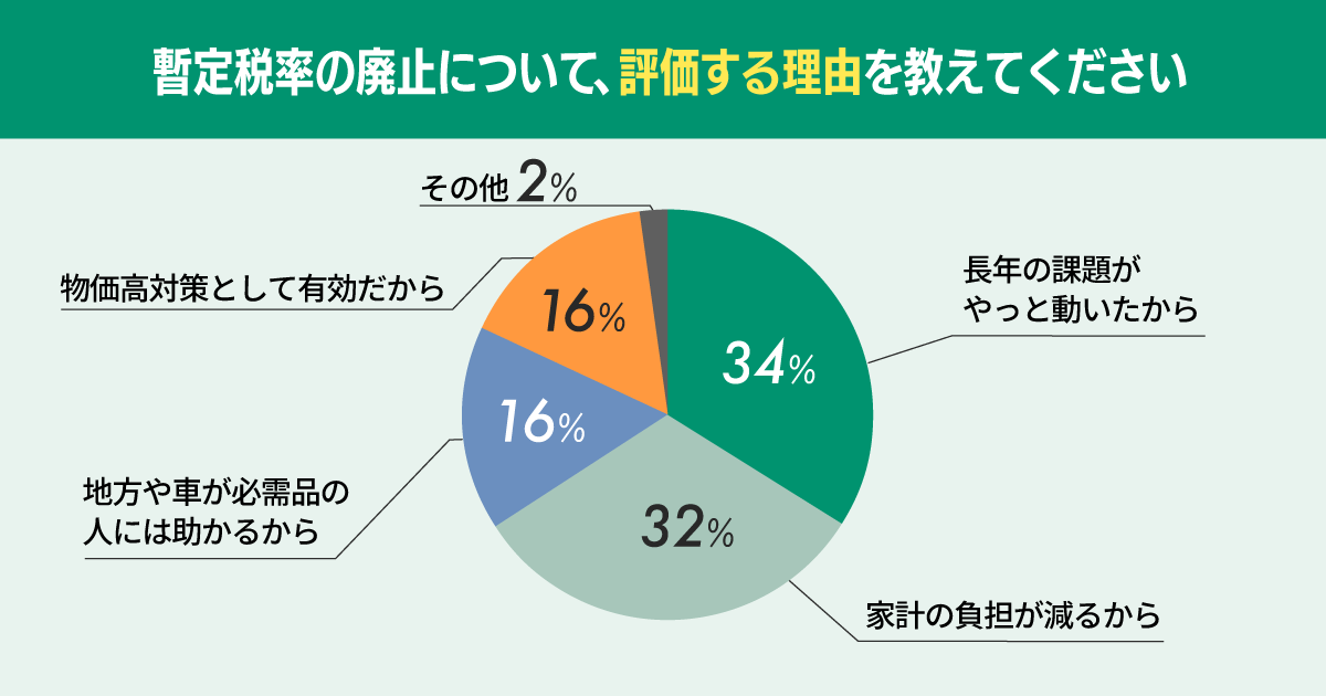 暫定税率の廃止について、9割近くのユーザーが「評価する」と回答し、最も多い結果となりました。