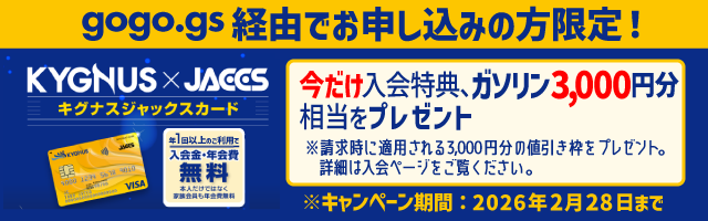 gogo.gs経由でお申し込みいただくと、通常のカード特典に加えて、「キグナス石油で使える3,000円分デポジット」 がもらえる キグナスジャックスカードキャンペーン も同時開催中。