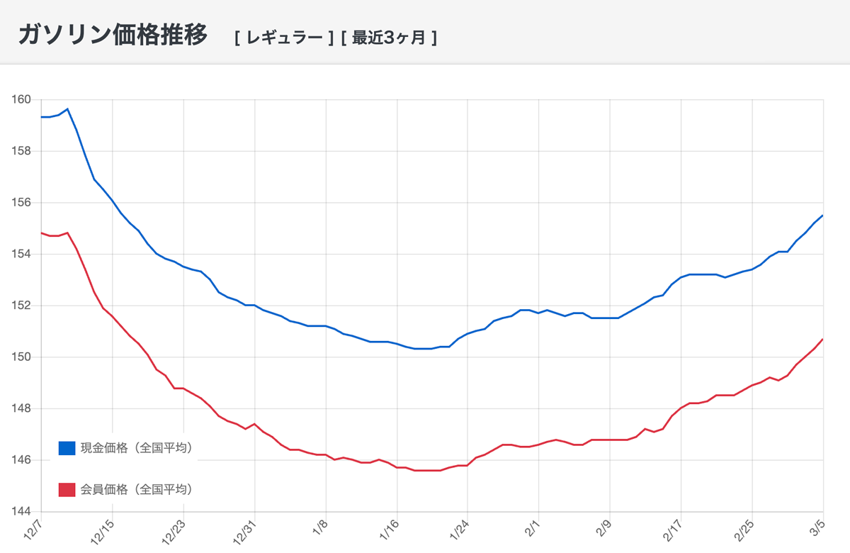 3月5日時点のガソリン価格は 155.5円ですが、今後再び ガソリン1L180円台に戻る可能性も考えられます。