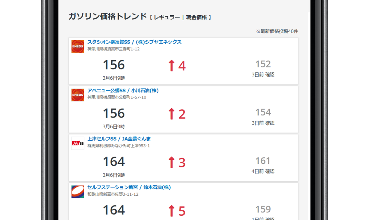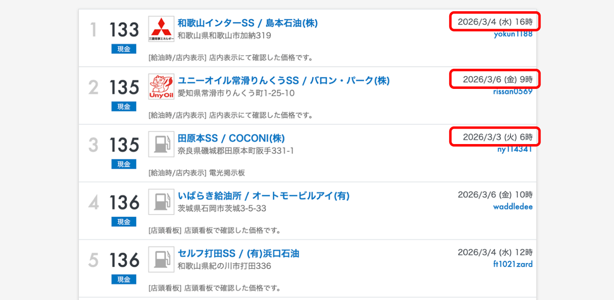 ランキングや各店舗ページから、ガソリン価格をご確認いただく場合は 確認日時も合わせてご確認 ください。