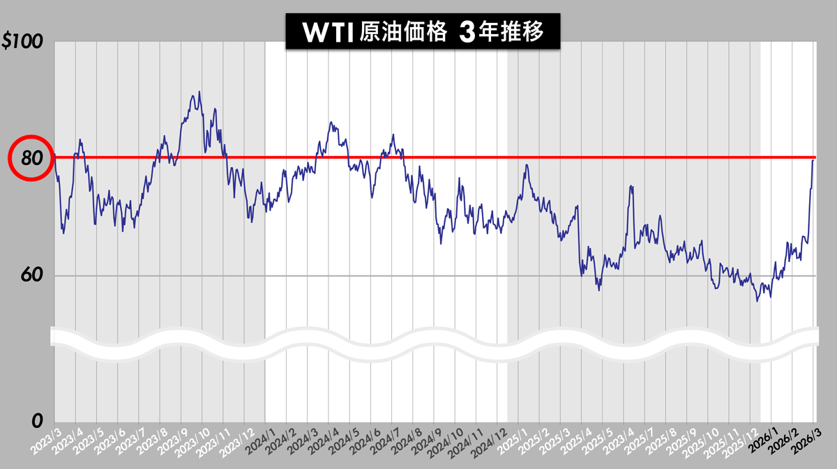 WTI原油価格が3月5日、1バレル=82ドル台に達し、2024年7月以来の高水準となりました。