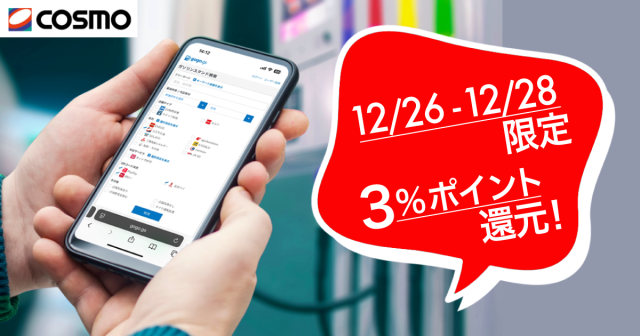 年末はコスモでおトクに給油しよう!12月26-28日限定でおトクなキャンペーンを開催。対象期間中にコスモで給油の際、PayPay・楽天ペイ・d払いの3%ポイント還元クーポンを利用できます。