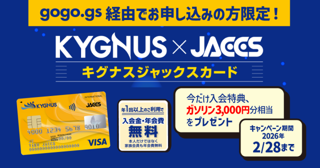 gogo.gsから「キグナスジャックスカード」に新規入会すると、通常のカード特典に加えて、今だけの限定特典「キグナス石油で使える3,000円分デポジット」が受け取れます。